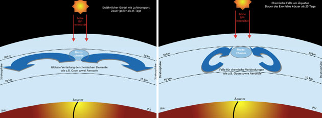 Die Simulationen zeigen, dass eine solche ungewöhnliche Tag-Nacht-Teilung dazu führen kann, dass einige chemische Verbindungen – darunter auch das besagte Ozon – durch die ebenso ungewöhnlichen Strömungsbedingungen in einer Art Äquator-Falle gefangen sein könnten: Während auf der Erde Strömungen aus den Äquatorregionen in Richtung der Pole u.a. das Ozon gleichmäßig über den gesamten Globus verteilt, könnte das bei Planeten in gebundener Rotation anders sein: „Zumindest für Planeten, die ihrem Stern nahe genug sind, um ihn in 25 Tagen oder weniger zu umkreisen, führen die Hauptströmungen von den Polen in Richtung Äquator und bewirken, dass sich das Ozon lediglich in Äquatornähe sammelt“, so die Forscher.