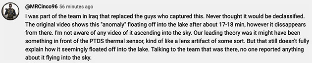 “Ich war Teil des Teams im Irak, das jene Truppe abgelöst hat, die diese Aufnahmen gemacht hat. Ich hätte niemals gedacht, dass die Aufnahmen deklassifiziert würden. Die Originalaufnahmen zeigen diese ‚Anomalie‘ wie sie nach etwa 17-18 Minuten in den See fliegt. Allerdings verschwindet es dort. Mir ist kein Video bekannt, das zeigt, wie dieses Ding wieder auftaucht und im Himmel verschwindet. Unsere Theorie damals war zunächst, dass es etwas vor dem PTDS-Thermal-Sensor selbst war, eine Art Linsenartefakt oder so etwas. Das erklärt aber nicht vollständig, wie dieses Ding offenbar davon und in den See schwebte. Als ich mit dem Team vor Ort sprach, berichtete aber niemand irgendwas davon, dass das Ding auch wieder in den Himmel flog.“