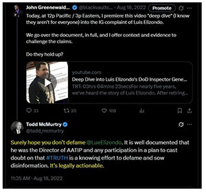 Elizondo selbst nimmt seine Behauptungen sehr ernst und hat sich Unterstützung von mehreren Anwälten gesichert, die ihn regelmäßig in sozialen Netzwerken verteidigen. Einer davon ist Todd McMurtry, ein bekannter Prozessanwalt, der öffentlich erklärte, dass das Infragestellen von Elizondos Direktor-Behauptung „juristisch angreifbar“ sei, da Elizondos Rolle als „Director of AATIP“ gut dokumentiert sei.