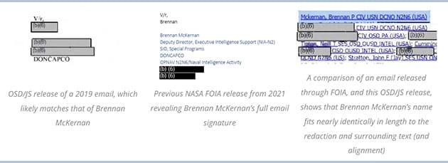 Hinweis: Um die offensichtliche Diskrepanz in der Anzahl der Zeilen zwischen den E-Mails zu erklären, lässt sich dies vermutlich leicht durch Änderungen in den Zuständigkeiten während des zweijährigen Zeitraums zwischen dem Versand der E-Mails erklären. Die E-Mail aus dem Jahr 2019 enthält in der Signatur vermutlich in der ersten Zeile den Ausdruck „V/r“ (eine gängige militärische Grußformel für „Very respectfully“), in der zweiten Zeile „Brennan“, in der dritten Zeile „Brennan McKernan“, in der vierten Zeile „SIO/Special Programs“ und in der fünften Zeile „DONCAPCO“. Vergleicht man dies mit der E-Mail aus dem Jahr 2021, stimmen – falls diese Spekulation zutrifft – die Längen der geschwärzten Zeilen mit den entsprechenden Zeilen überein. Es ist wahrscheinlich, dass McKernan im Laufe der Zeit zusätzliche Titel durch Beförderungen, Versetzungen oder beides erhalten hat.