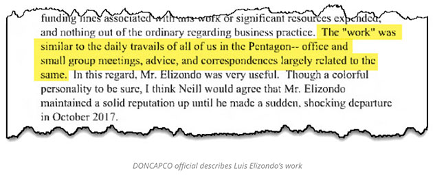 „Mr. Elizondo spielte tatsächlich eine Rolle bei der Vermittlung von Kontakten und der Herstellung von Verbindungen zu anderen Einheiten des Verteidigungsministeriums, die an nachrichtendienstlichen bzw. sicherheitsrelevanten Fragestellungen arbeiteten, die denen der Marine ähnelten … In dieser Hinsicht war Mr. Elizondo sehr hilfreich.“