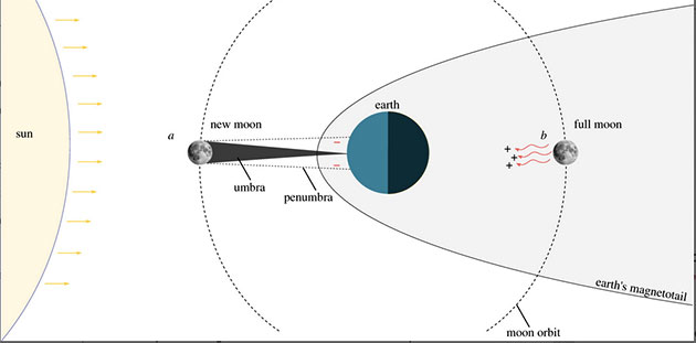 Bei Neumond entstehen so auf der Erdoberfläche regelrechte Mondschatten aus negativ geladenen Teilchen (siehe Diagramm: a). Während Vollmondes (b) blick der Mond sozusagen auf die Nachtseite der Erde (und steht nun nachts über dem Horizont). Seiner Umlaufbahn folgend, beeinflusst der Mond nun den Magnetschweif der Erde und erzeugt elektrische Störungen aus positiv geladenen Teilchen, die ebenfalls die Erdoberfläche erreichen.