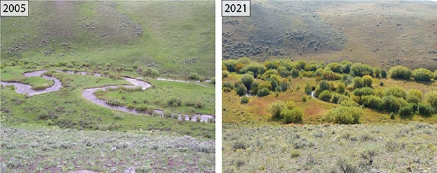 Die Studie basiert auf bereits veröffentlichten Daten von 25 Flussuferstandorten über einen Zeitraum von 20 Jahren (2001–2020) gesammelt wurde, ergab einen bemerkenswerten Anstieg des Kronen-Volumens von Weiden um 1.500 % entlang der Ufergebiete im nördlichen Yellowstone-Nationalpark. Dies wurde durch die Auswirkungen auf die Elchpopulation verursacht, die sich infolge der Wiederherstellung einer vollständigen Raubtiergemeinschaft nach der Wiederansiedlung der Wölfe in den Jahren 1995–96 ergaben.